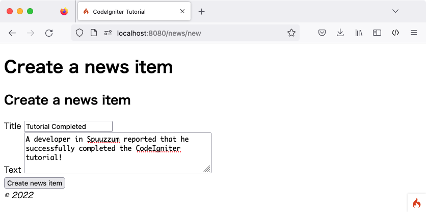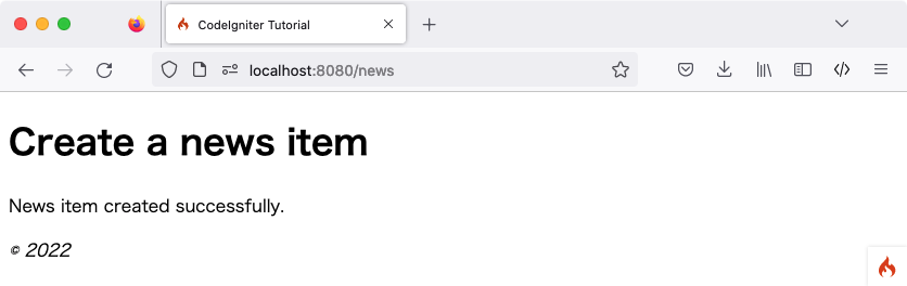 现在指向你安装了 CodeIgniter 的本地开发环境的浏览器,并在 URL 中添加 /news/new。 添加一些新闻并查看你创建的不同页面。